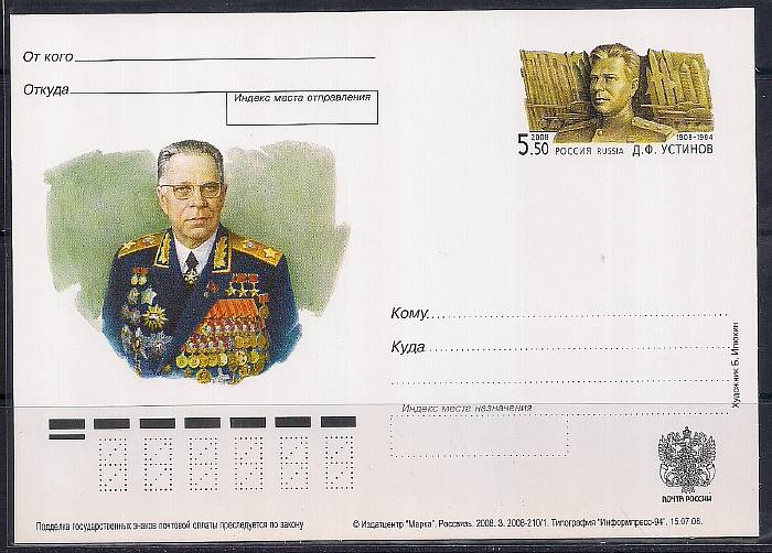 ПК с ОМ. 100 лет со дня рождения Д.Ф. Устинова, 2008 год, № 190
