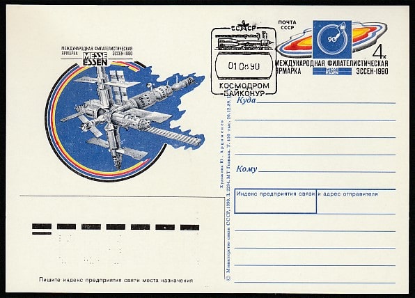 ПК с ОМ. Филярмарка "Эссен-90", гашение 01.08.1990 год, к/Байконур (старт пилотируемого КК "Союз ТМ-10") (Ю)