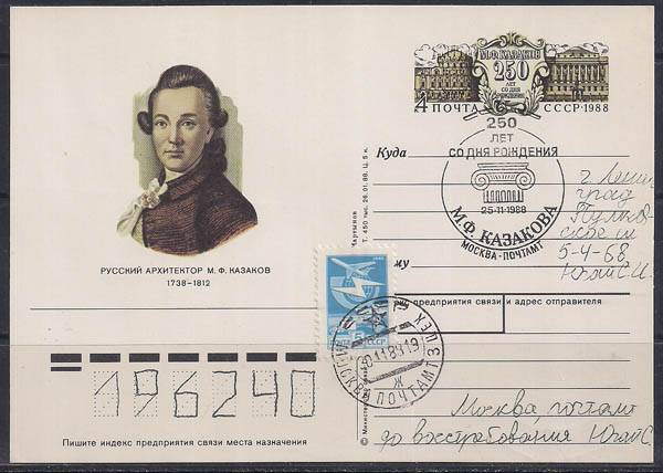 ПК с ОМ и СГ. 250 лет со дня рождения архитектора М.Ф. Казакова, 25.11.1988 год, Москва почтамт (колонна на штемпеле), прошла почту (Ю)