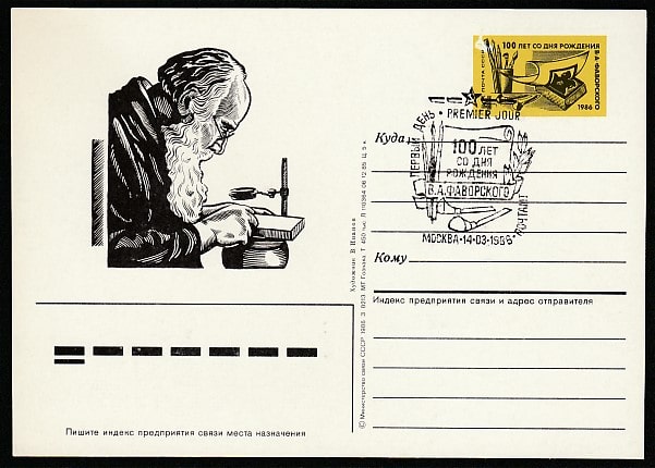 ПК с ОМ и спецгашением. 100 лет со дня рождения В.А. Фаворского, 14.03.1986 год, Москва, почтамт. Брак печати на марке