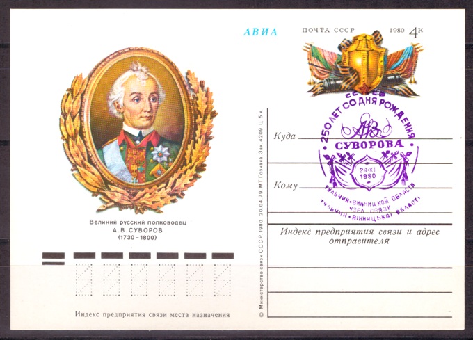 ПК с ОМ со спецгашением 250 лет со дня рождения Суворова. Тульчин-Виницкой области УС, 24.11.1980 год