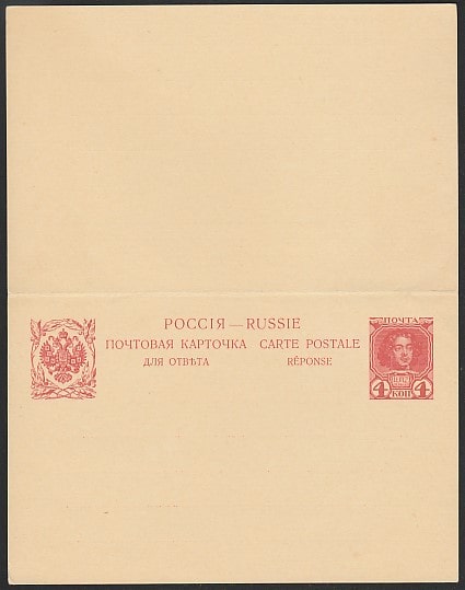 ПК с оплаченным ответом. Марка 1913 года, ном. 4 к. + 4 к. (Пётр I)