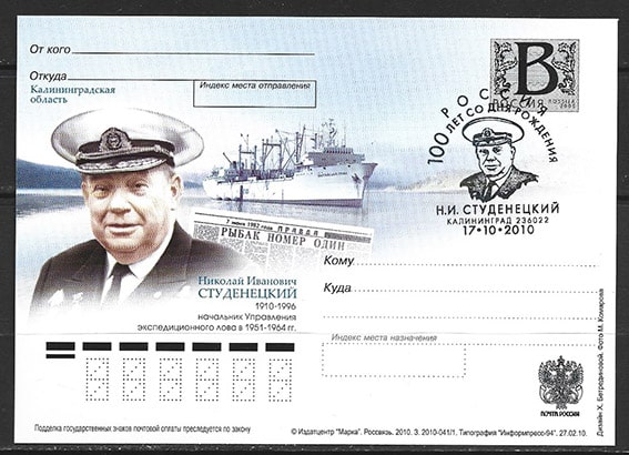 ПК со спецгашением - 100 лет со дня рождения Н.И. Студенецкому, Калининград 17.10.2010 год