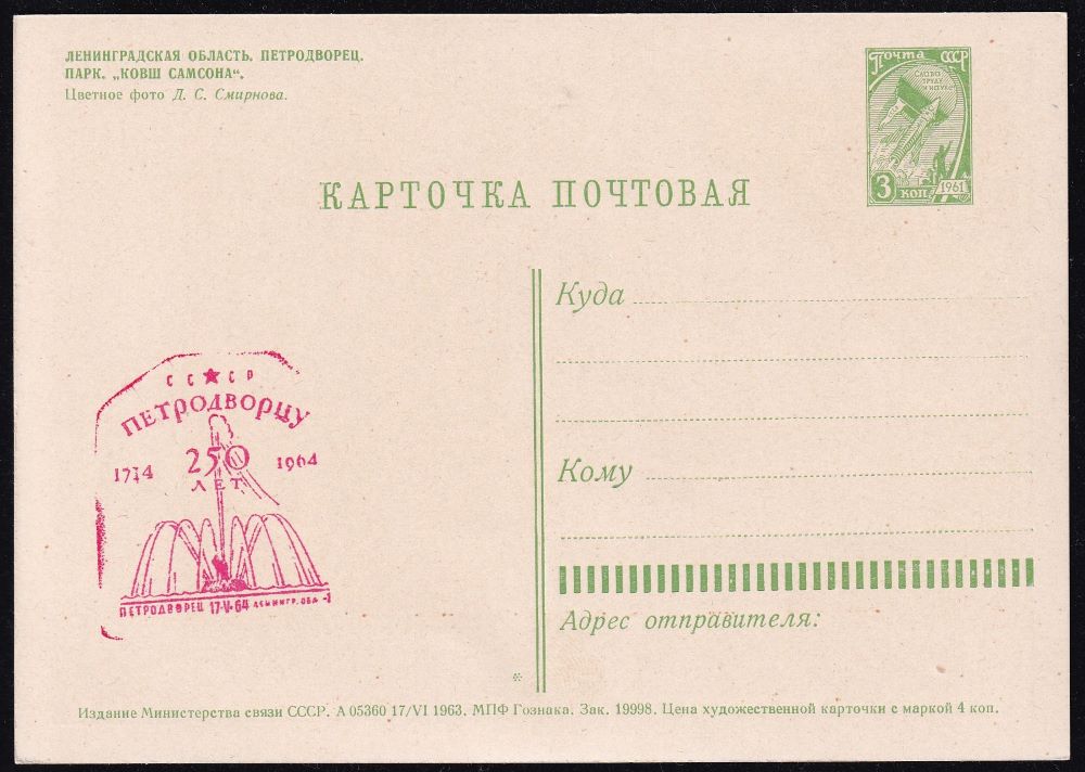 ПК со спецгашением - 250 лет Петродворцу.17.06.1963 год, Петродворец