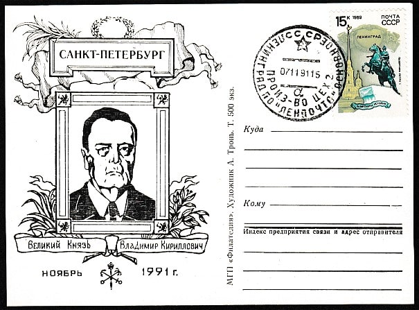 ПК. Великий князь В.К. Романов, штемпель гашения, 1991 год. МГП "Филателия". Тир. 500 экз.