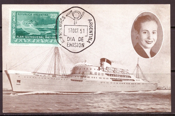 Почтовая карточка. Аргентина. Корабль. Прошла почту 17 октября 1951 год