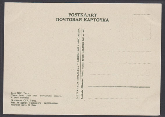 Почтовая карточка. Эстонская ССР. Тарту. Вид на здание Тартуского Горисполкома, 1955 год