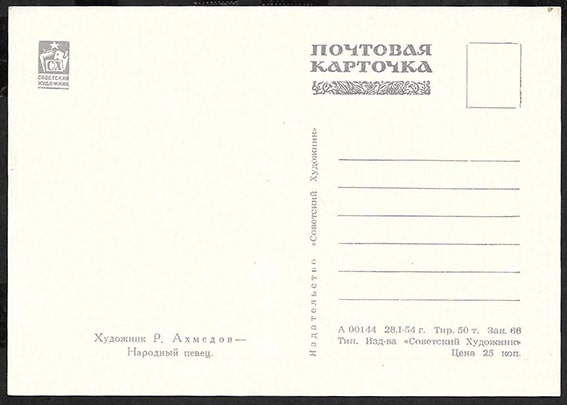 Почтовая карточка. Худ. Р. Ахмедов. Народный певец. 1954 год. Изд. Советский Художник