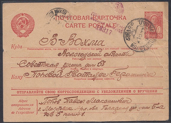 Почтовая карточка. Марка - Колхозница с серпом. 1939 г. Цензура 18317. 1944 год