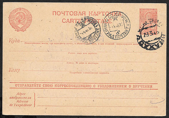 Почтовая карточка № 4-10. Агитационный выпуск 1941-1945 гг. Отправляйте свою корреспонденцию с уведомлением о вручении, прошла почту