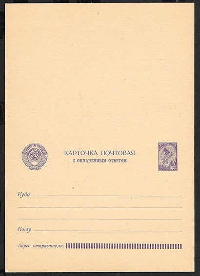 Почтовая карточка с оплаченным ответом. Марка 3 копейки. № 1.1.176