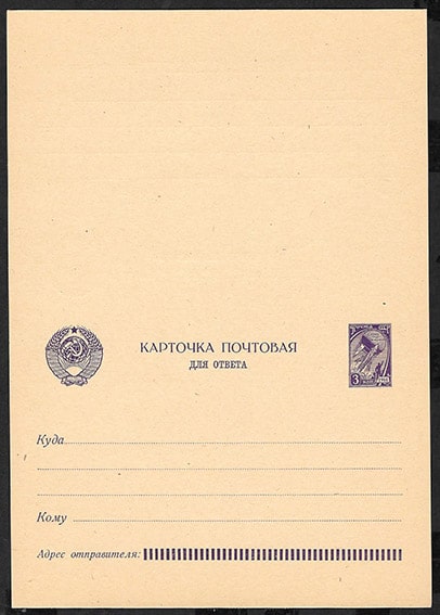 Почтовая карточка с оплаченным ответом. Марка 3 копейки