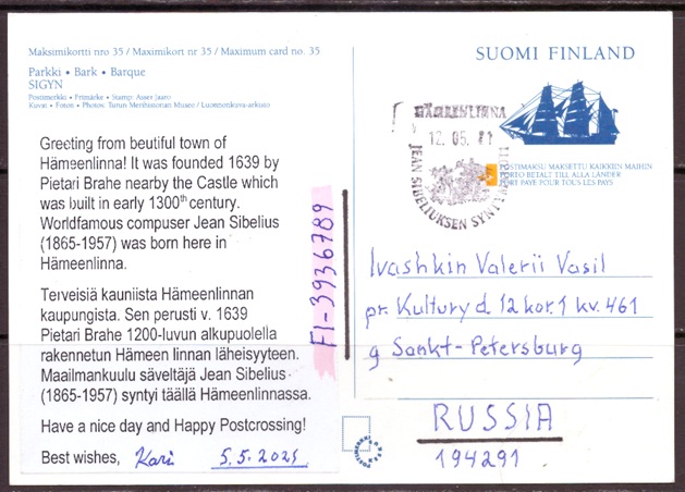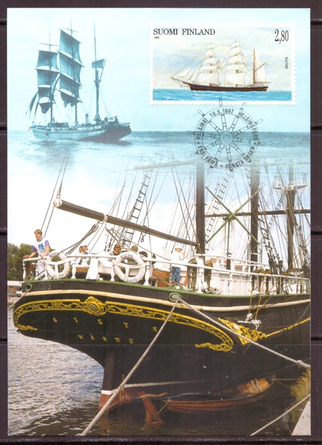Почтовая карточка. Суоми. Финляндия. Парусный корабль. Прошла почту 19.05.1997 год