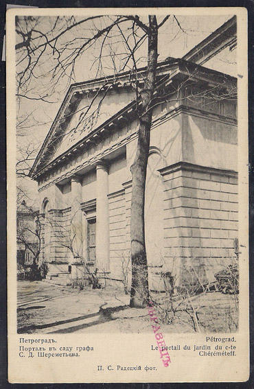 Почтовая карточка. В пользу Общ. Св. Евгении. Петроград. Портал в саду графа Шереметьева. Фото Радецкого. 1915 г.