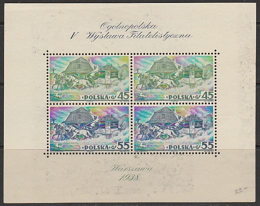 Польша 1938 год. V Национальная филвыставка в Варшаве, блок (наклейка) (130/Х/100) (тонкое место)