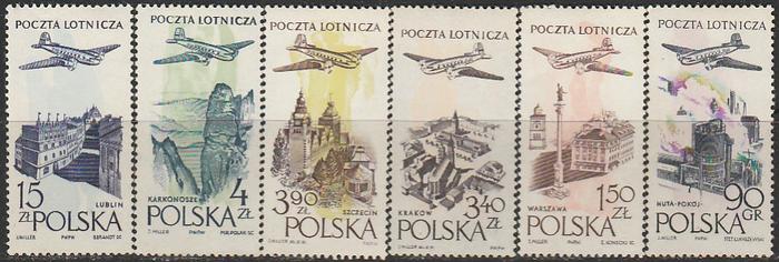 Польша 1957 год. Авиация над городами Польши, 6 марок
