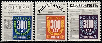 Польша 1961 год. 300 лет польской прессе. 3 марки