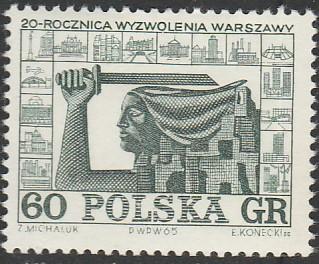 Польша 1965 год. 20 лет Освобождению Варшавы. Голова "Варшавской Ники", руины; 1 марка