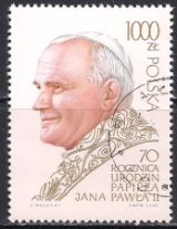 Польша 1990 год. 70 лет со дня рождения папы Павла 2-го. 1 гашеная марка