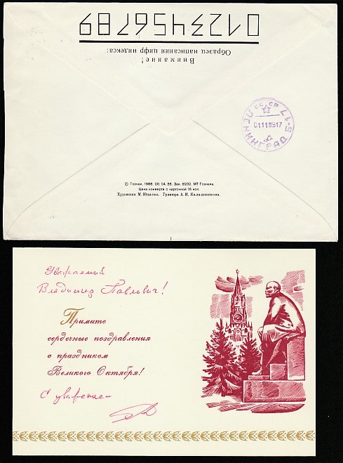 Поздравительная открытка с конвертом. Слава Великому Октябрю! 1988 год