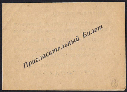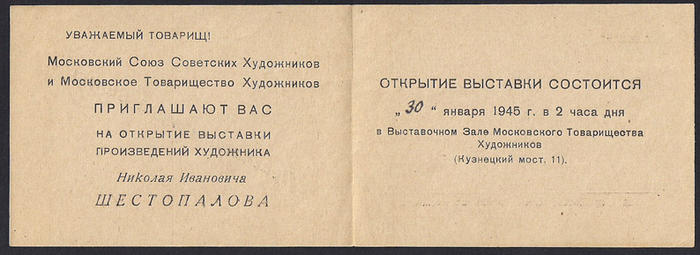 Пригласительный билет. Выставка художника Шестопалова. 1945 г.Пригласительный билет. Выставка художника Шестопалова. 1945 г.
