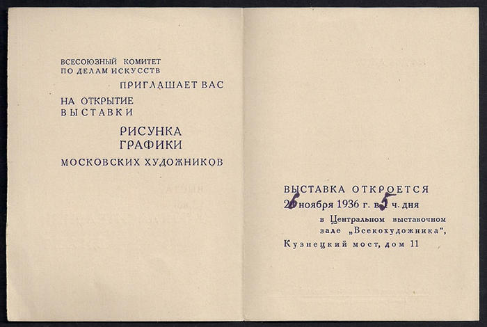 Пригласительный билет. Выставка рисонка и графики московских художников. 1936 г.Пригласительный билет. Выставка рисонка и графики московских художников. 1936 г.