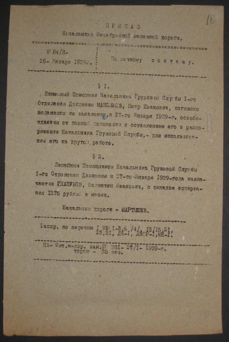 Приказ начальника Октябрьской железной дороги № 84/Л от 26.01.39 г.