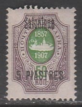 Россия 1909-1910 год. "Русский Левант". РОПиТ. НДП. Салоники, 5 рi/50 к, 1 марка из серии (наклейка)
