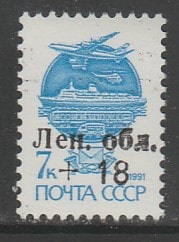 Россия 1992 год. Местный выпуск. Ленинградская область, НДП "Лен. обл. + 18" на стандартной марке СССР 1991 года выпуска.