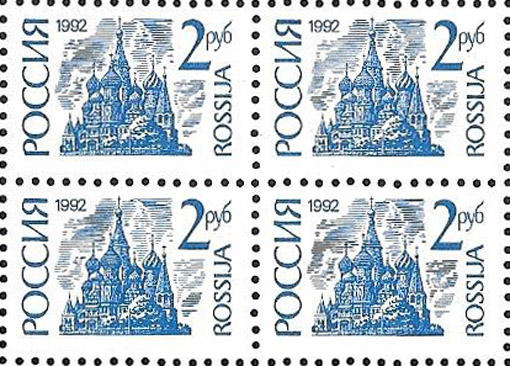 Россия 1992 год. Стандарт. 2 рубля, квартблок. Мелованная бумага. Перфорация гребенка 12 1/4 : 11 3/4