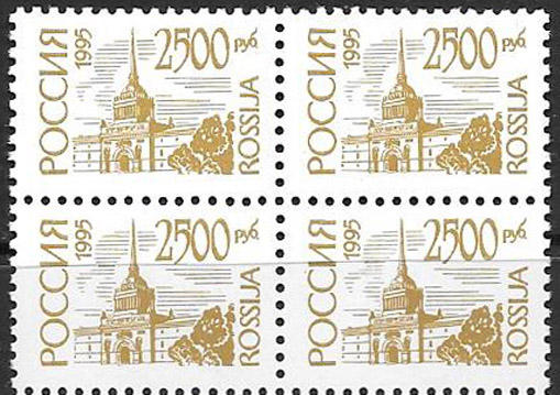 Россия 1995 год. Стандарт. 2500 рублей. Адмиралтейство. Мелованная бумага. Перфорация гребенка 12 1/4 : 11 3/4, квартблок