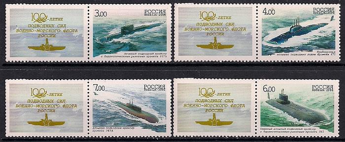Россия 2006год. 100-летие подводных сил ВМФ России. 4 марки с левым купоном. (3,4,6,7,