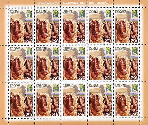 Россия 2017 год, Совместный выпуск Администраций связи стран – членов РСС. Национальные промыслы. Лапти, лист