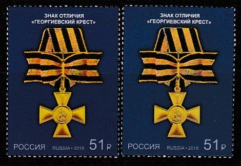 Россия 2018 год. Знак отличия "Георгиевский Крест". Разновидность - разный оттенок, 2 марки.