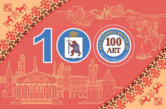 На почтовой марке размещена надпись «Республика Марий Эл. 100 лет». На полях блока — официальная символика и национальный орнамент; природные и архитектурные достопримечательности республики.