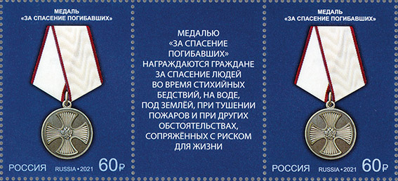 Россия 2021 год. Медаль - За спасение погибавших, сцепка с купоном