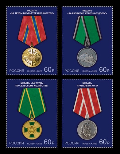 На почтовых марках изображены медали «За труды по сельскому хозяйству», «За развитие железных дорог», «За труды в культуре и искусстве» и медаль Луки Крымского.