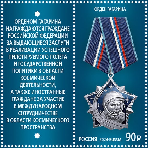 Россия 2024 год. Серия Государственные награды РФ, Орден Гагарина, 1 марка с купоном