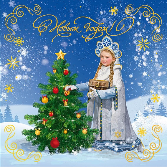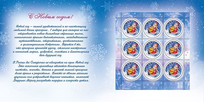 В состав сувенирного набора в художественной обложке "С Новым годом! (2-ая форма выпуска)" входит марочный лист марки №3357-I "С Новым годом! Снегурочка с самоваром" с голографической фольгой.