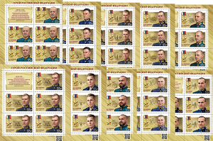 Россия 2025 год. Герои Российской Федерации. Серия из 10 листов. 1 лист из 5 марок и купона. (ном. 55 ₽)