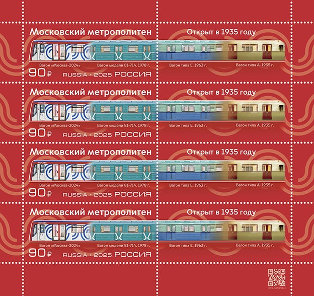 На почтовой марке на фоне символики Московского метрополитена изображены вагоны «Москва-2024» и вагон модели 81-714, на купоне — вагоны типов Е и А.