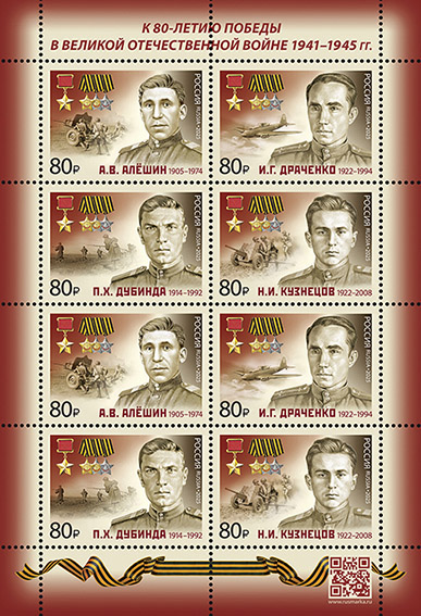 Россия 2025 год. Полные кавалеры ордена Славы — Герои Советского Союза. А.В. Алёшин (1905–1974), И.Г. Драченко (1922–1994), П.Х. Дубинда (1914–1992), Н.И. Кузнецов (1922–2008), лист (ном. 80 р.)