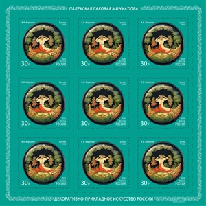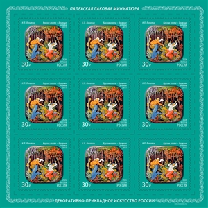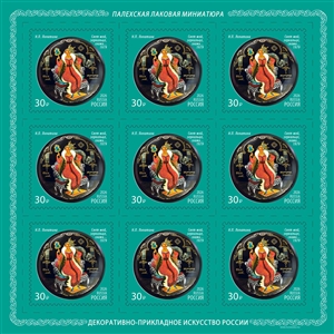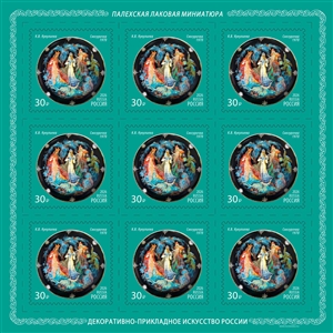 Россия 2026 год. Серия «Декоративно-прикладное искусство РФ. Палехская лаковая миниатюра» 4 листа из 9 марок (ном. 30₽)