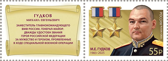 Россия 2025 год. Серия «Герои РФ». М.Е. Гудков (1983–2025), дважды Герой РФ, 1 марка с купоном (ном. 55 р.)