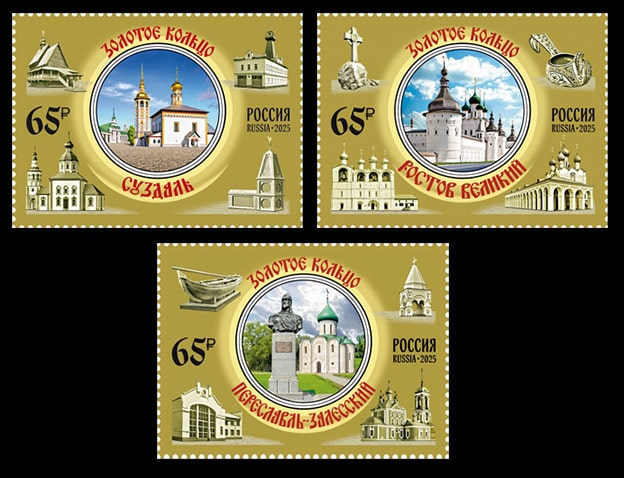 Россия 2025 год. Серия «Города Золотого кольца России». Переславль-Залесский, Ростов Великий, Суздаль, ном. 65 р., 3 марки