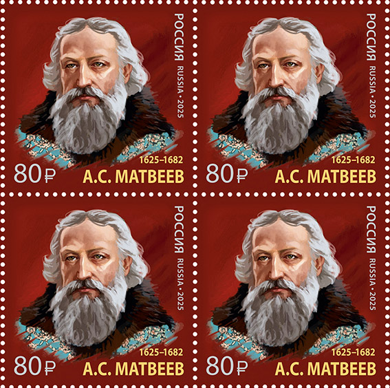Россия 2025 год. Серия «История российской дипломатии». 400 лет со дня рождения А.С. Матвеева (1625–1682), главы Посольского и Малороссийского приказов, квартблок (ном. 80 р.)