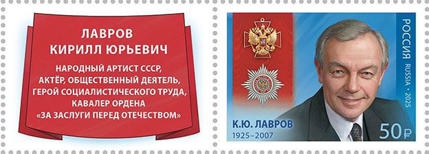 Россия 2025 год. Серия «Кавалеры ордена "За заслуги перед Отечеством"». 100 лет со дня рождения К.Ю. Лаврова (1925–2007), актёра, народного артиста СССР, ном. 50 р., 1 марка с купоном