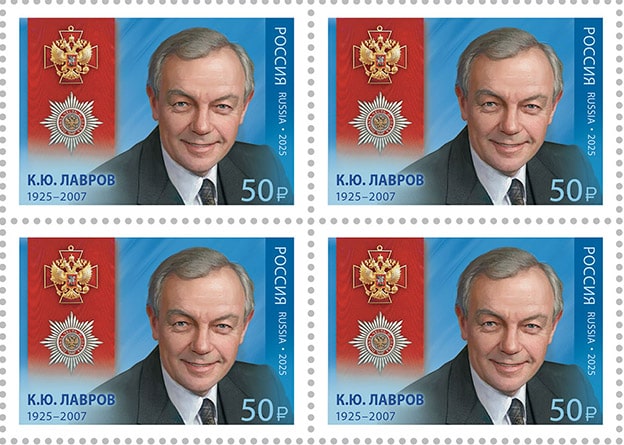 Россия 2025 год. Серия «Кавалеры ордена "За заслуги перед Отечеством"». 100 лет со дня рождения К.Ю. Лаврова (1925–2007), актёра, народного артиста СССР, ном. 50 р., квартблок