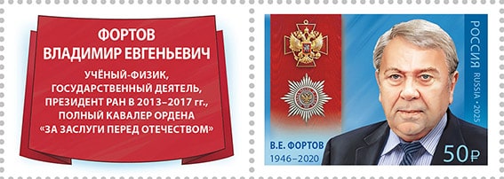 Россия 2025 год. Серия «Кавалеры ордена "За заслуги перед Отечеством"». В.Е. Фортов (1946–2020), физик, академик РАН, 1 марка с купоном (ном. 50 р.)