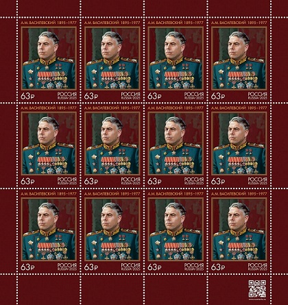 Россия 2025 год. Серия «Маршалы Советского Союза». 80 лет Победы в ВОВ. Маршал А.М. Василевский. Блок из 12 марок (ном 63 ₽)